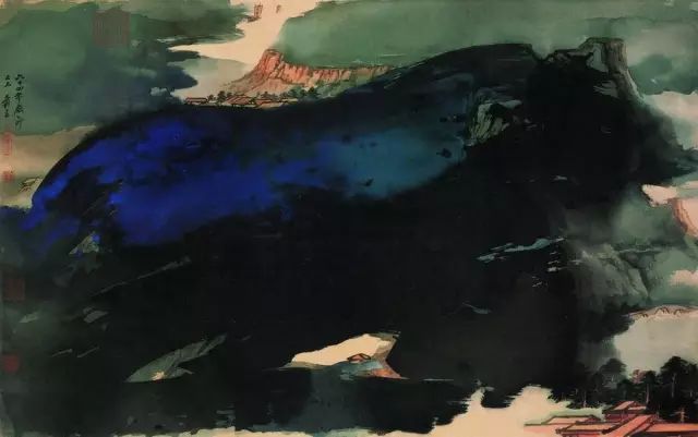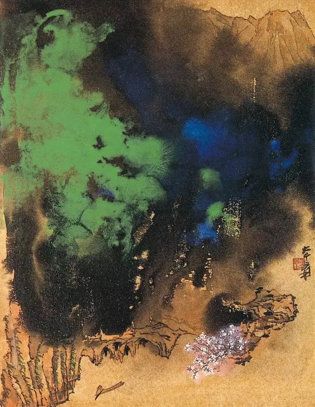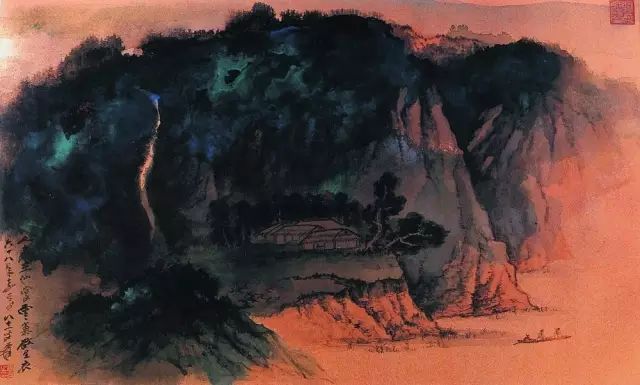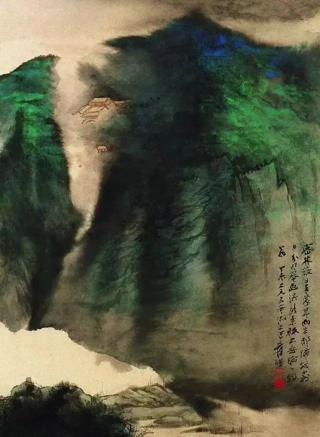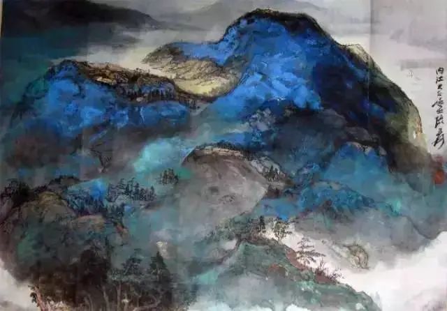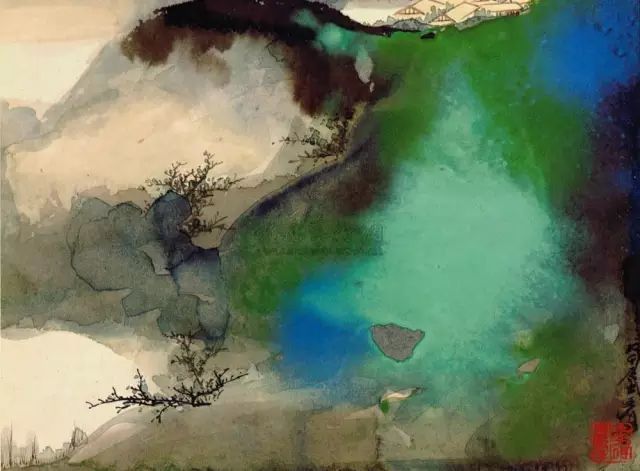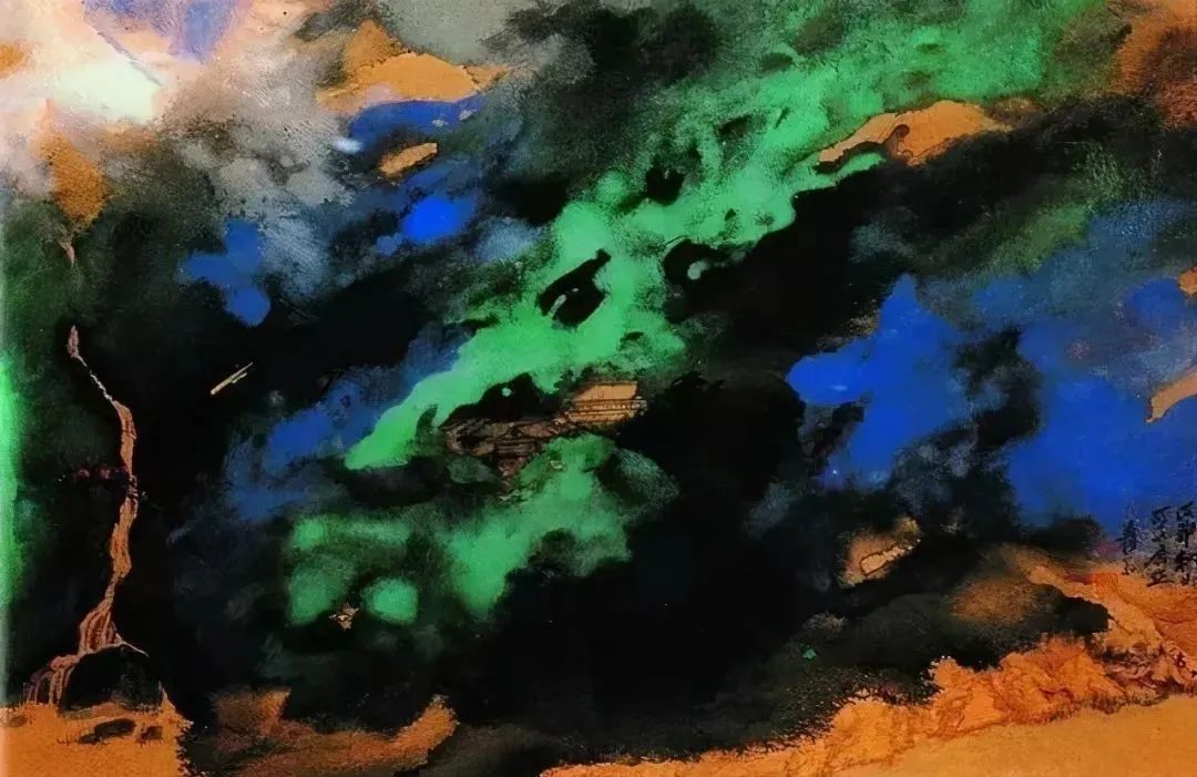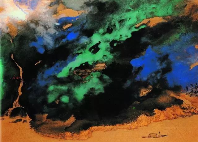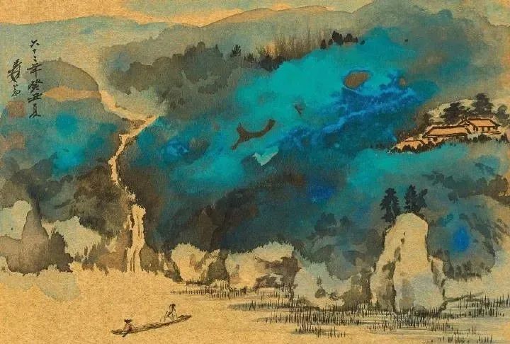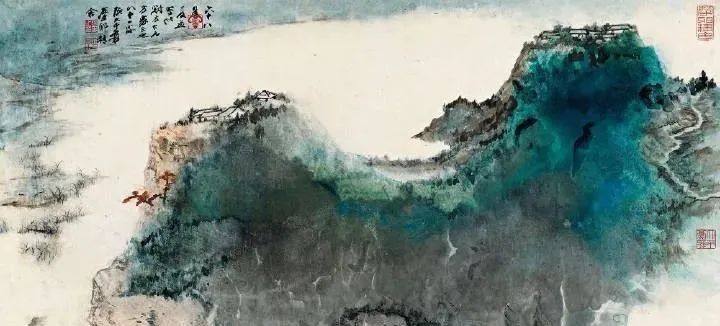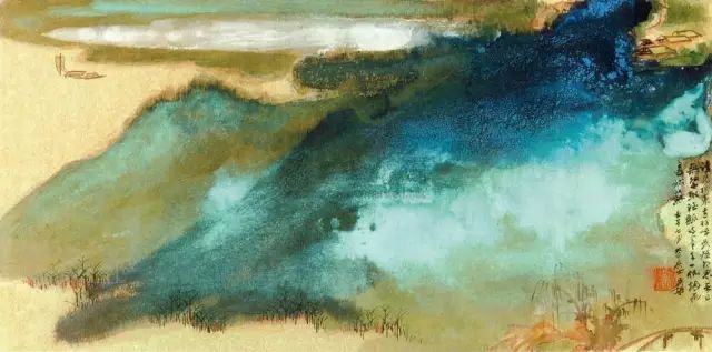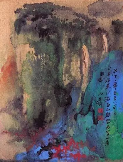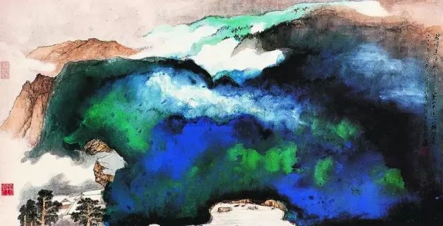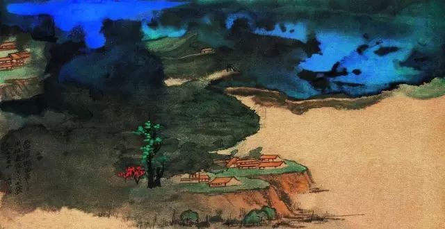 张大千 《桃源图》局部 但行为一种艺术创作的工夫,泼彩并不是盲目地纸上乱泼一气,作者必须对画面的艺术形象有所构念念,什么部位泼什么色调,若何泼,需要达到什么成果,以后整理成什么形象,心中都要有所准备。