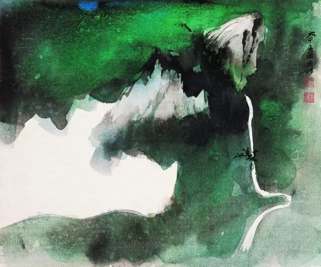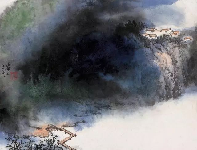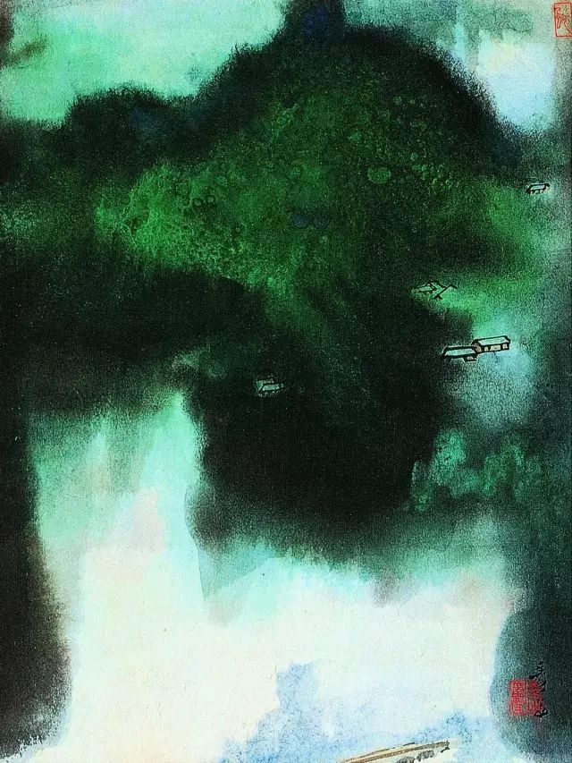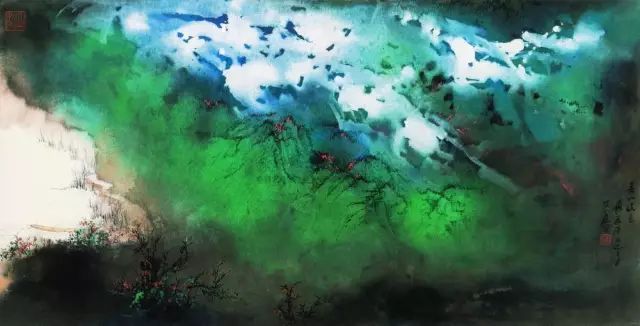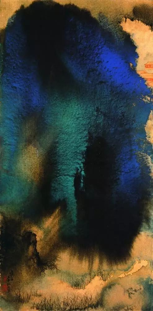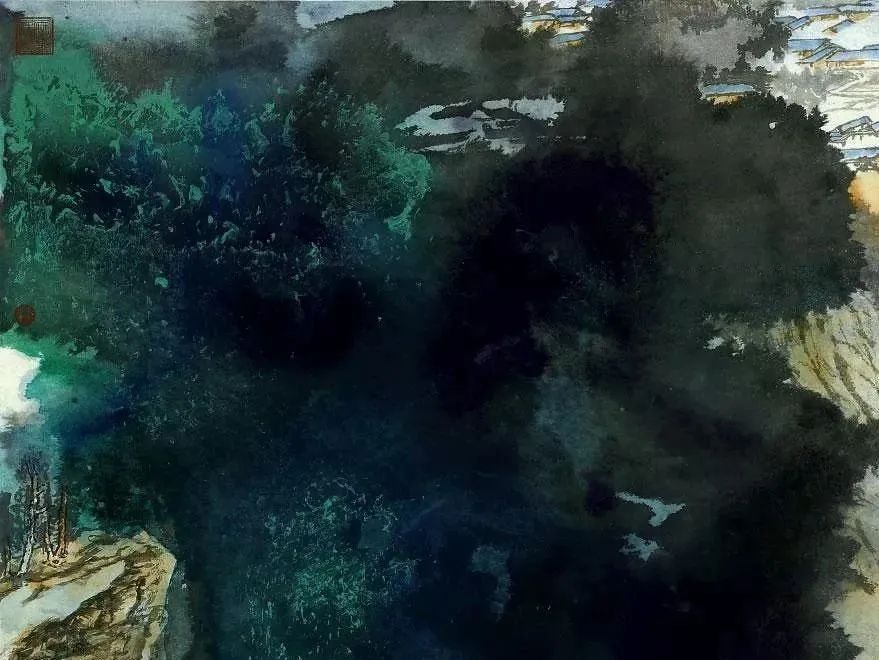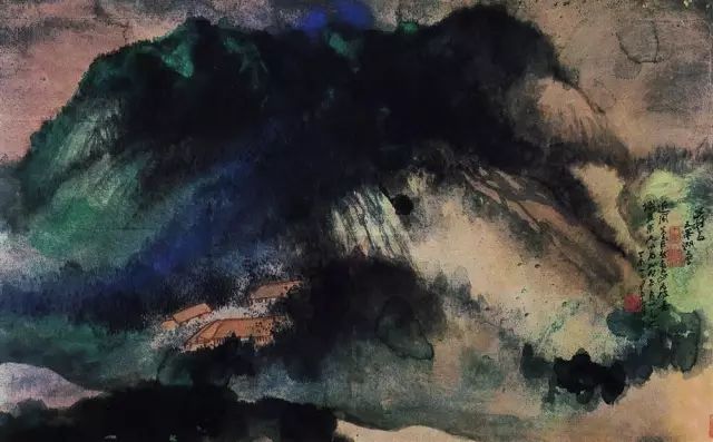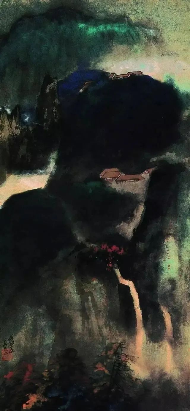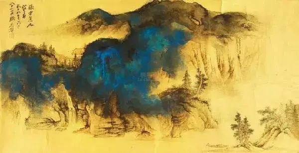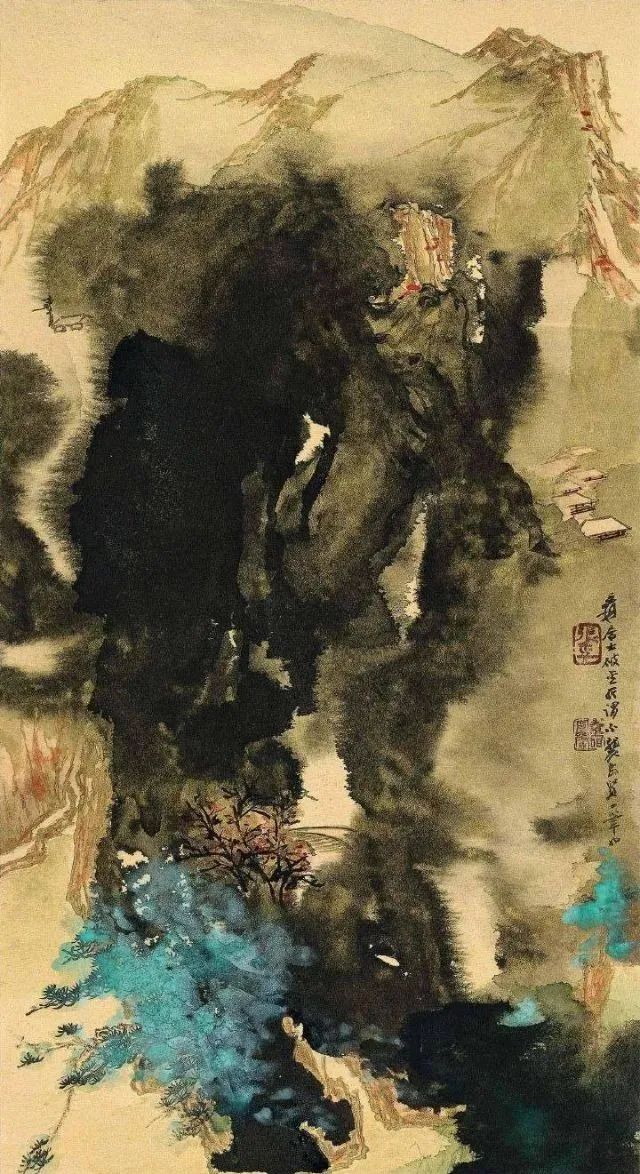 张大千 《桃源图》局部 但行为一种艺术创作的工夫,泼彩并不是盲目地纸上乱泼一气,作者必须对画面的艺术形象有所构念念,什么部位泼什么色调,若何泼,需要达到什么成果,以后整理成什么形象,心中都要有所准备。