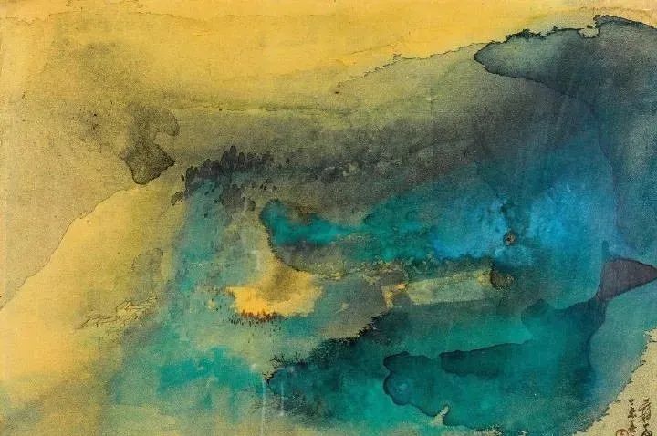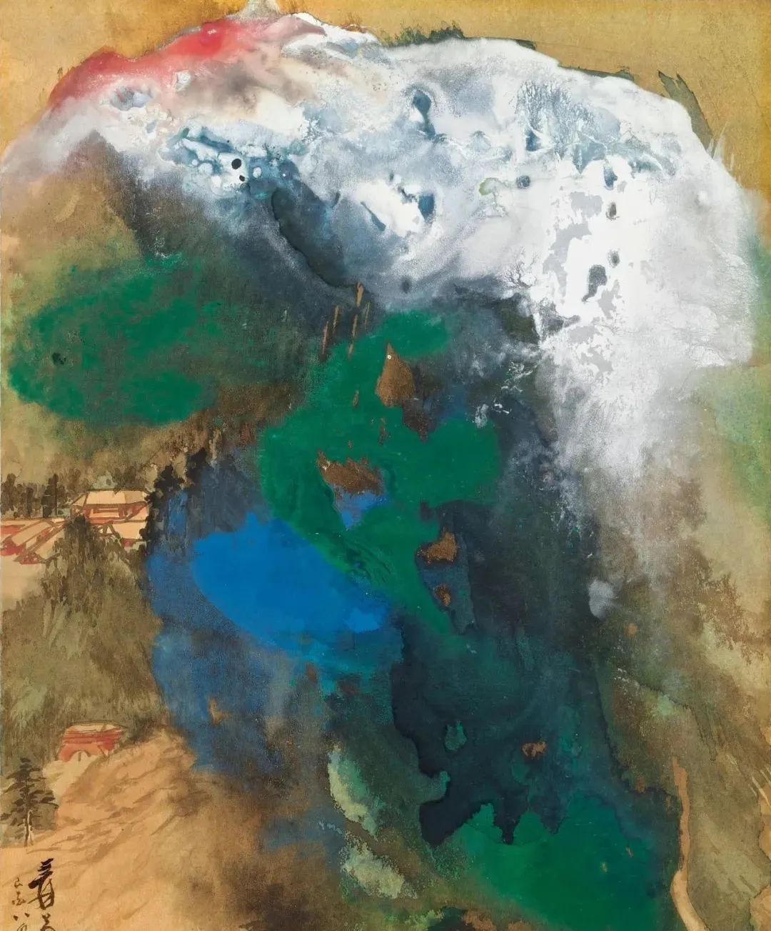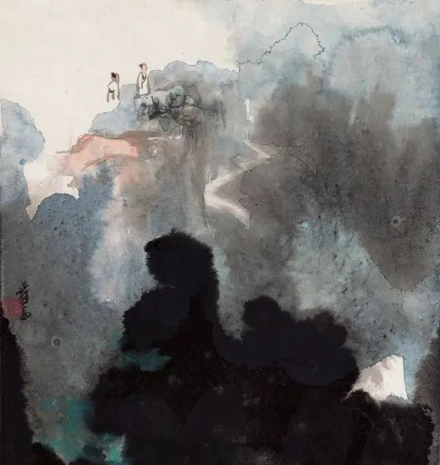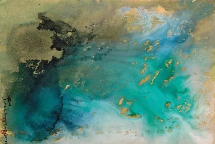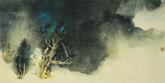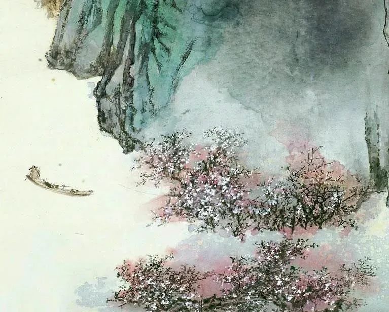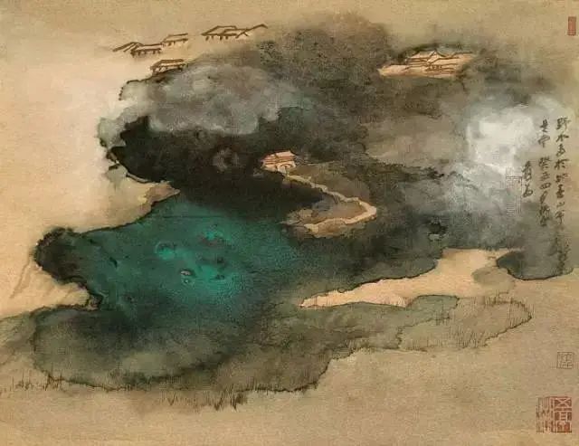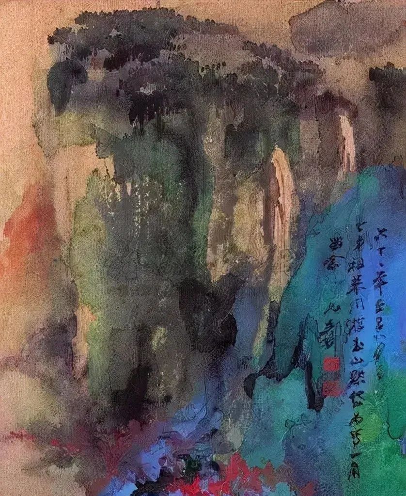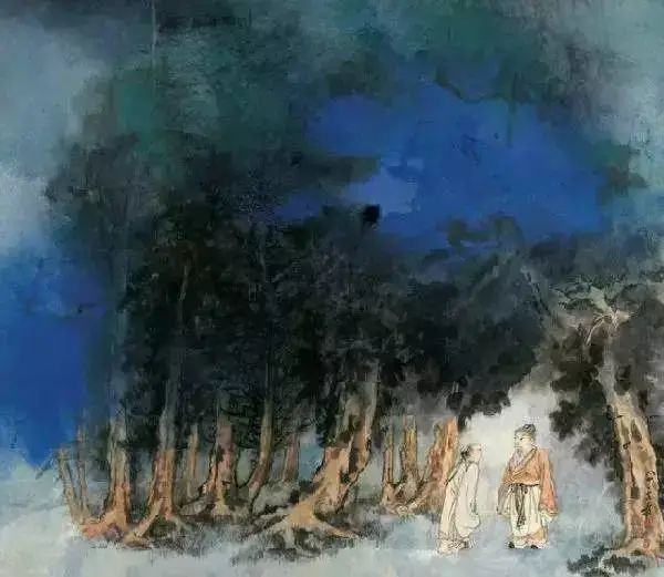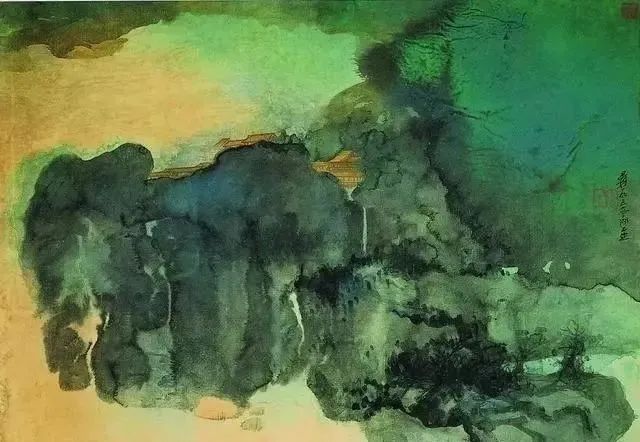 张大千 《桃源图》局部 但行为一种艺术创作的工夫,泼彩并不是盲目地纸上乱泼一气,作者必须对画面的艺术形象有所构念念,什么部位泼什么色调,若何泼,需要达到什么成果,以后整理成什么形象,心中都要有所准备。