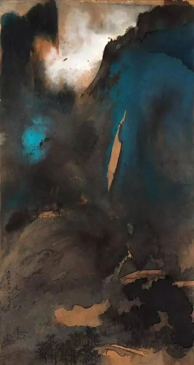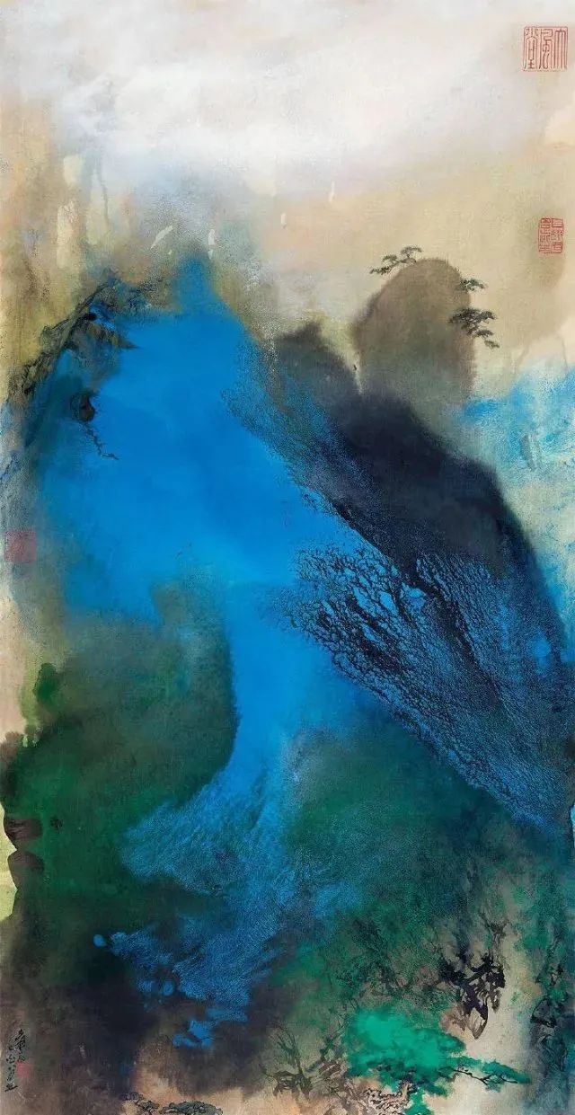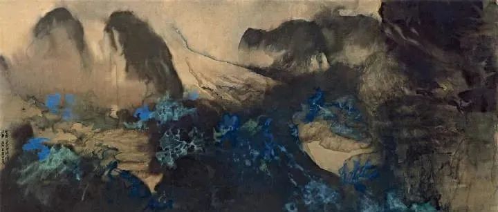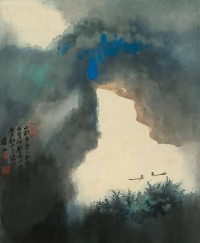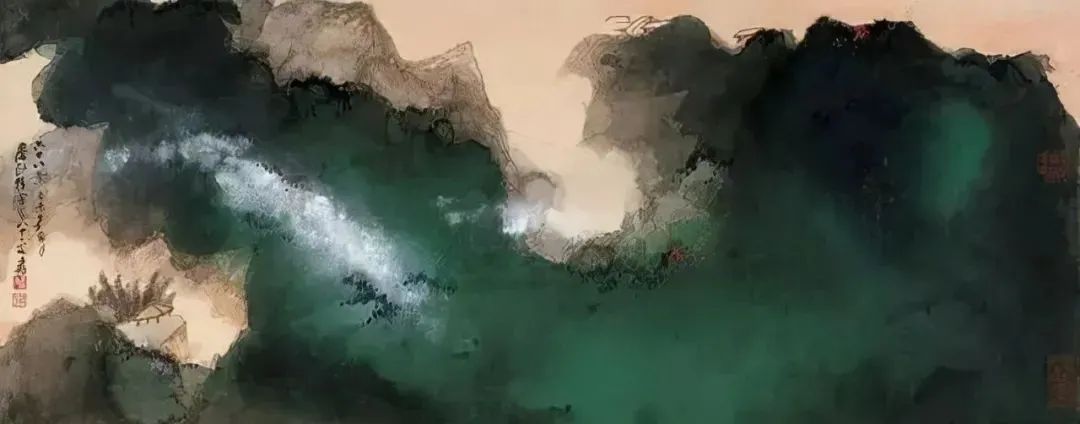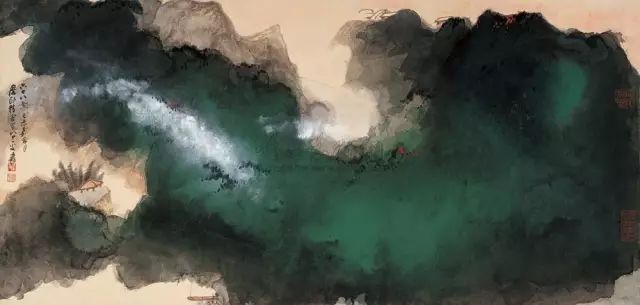 张大千 《桃源图》局部 从张大千的泼彩作品中,咱们还不错发现,张大千的泼墨泼彩在创作之前早已胸中有丘壑了,在开阔的构念念之下,墨彩的流动却有着鬼出神入的不可先见性,张大千的泼墨泼彩就是在势必王国息争脱王国之间徘徊,产生了今天咱们所见的一个个令东说念主烂醉的魔幻宇宙。