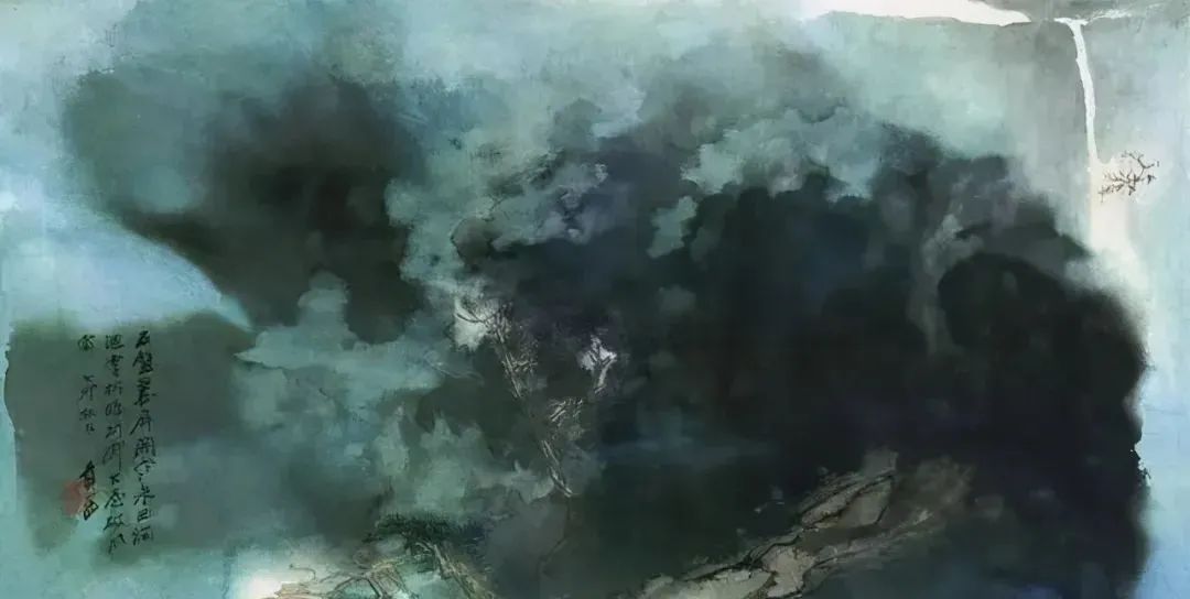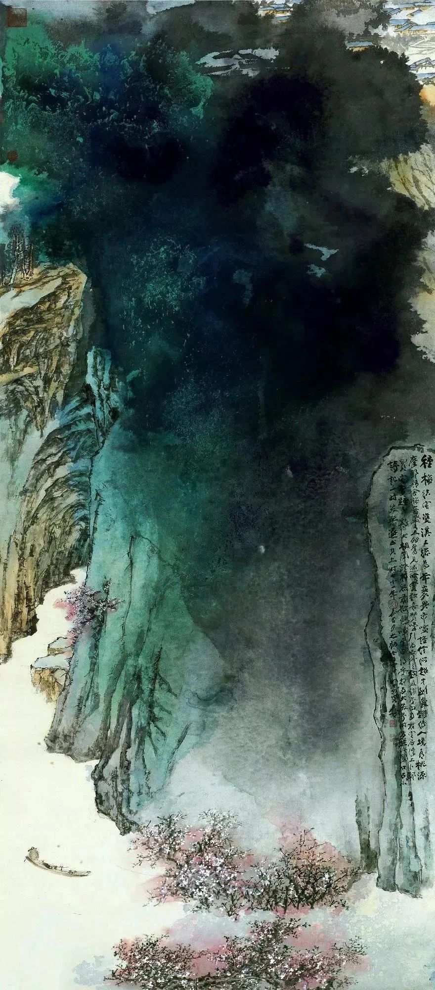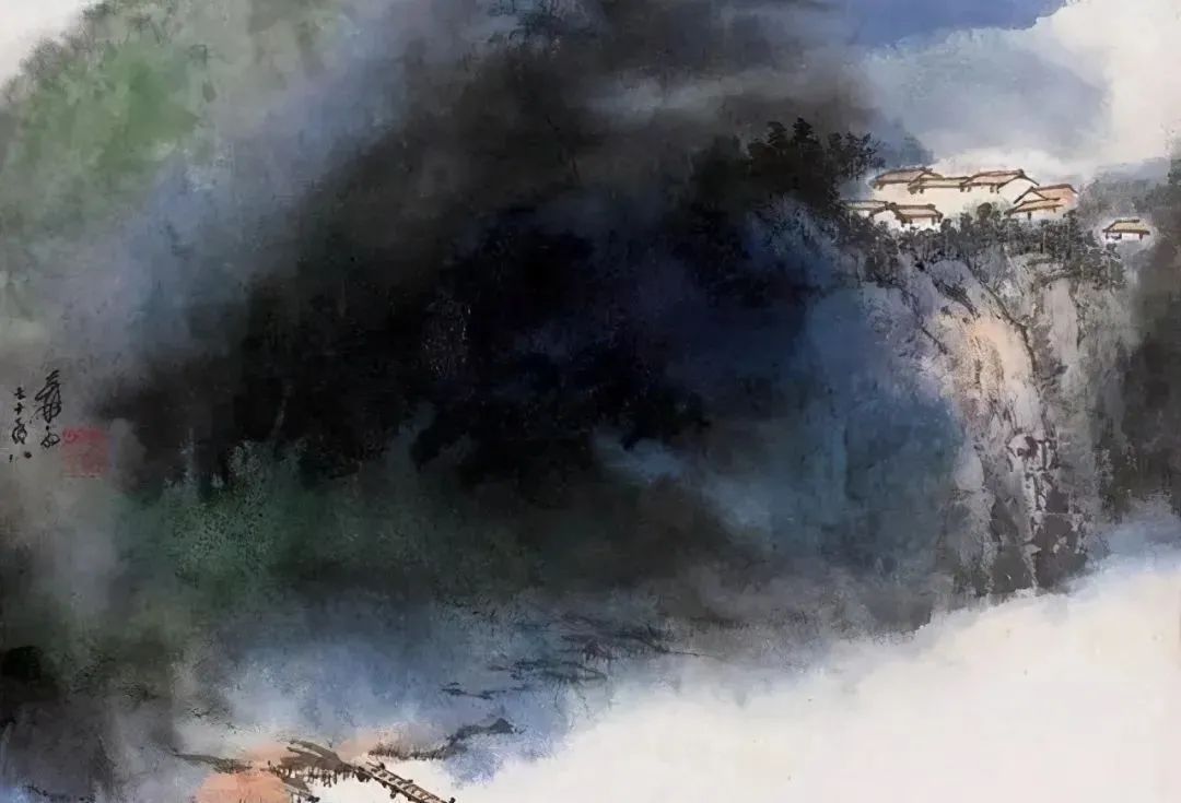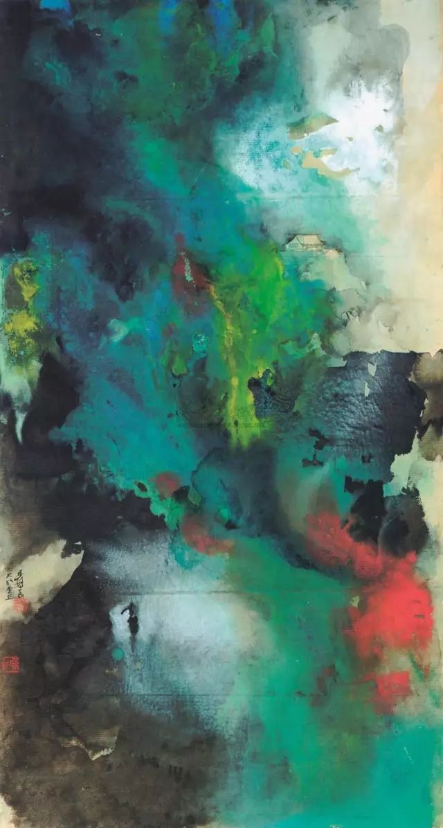 张大千 《桃源图》局部 从张大千的泼彩作品中,咱们还不错发现,张大千的泼墨泼彩在创作之前早已胸中有丘壑了,在开阔的构念念之下,墨彩的流动却有着鬼出神入的不可先见性,张大千的泼墨泼彩就是在势必王国息争脱王国之间徘徊,产生了今天咱们所见的一个个令东说念主烂醉的魔幻宇宙。