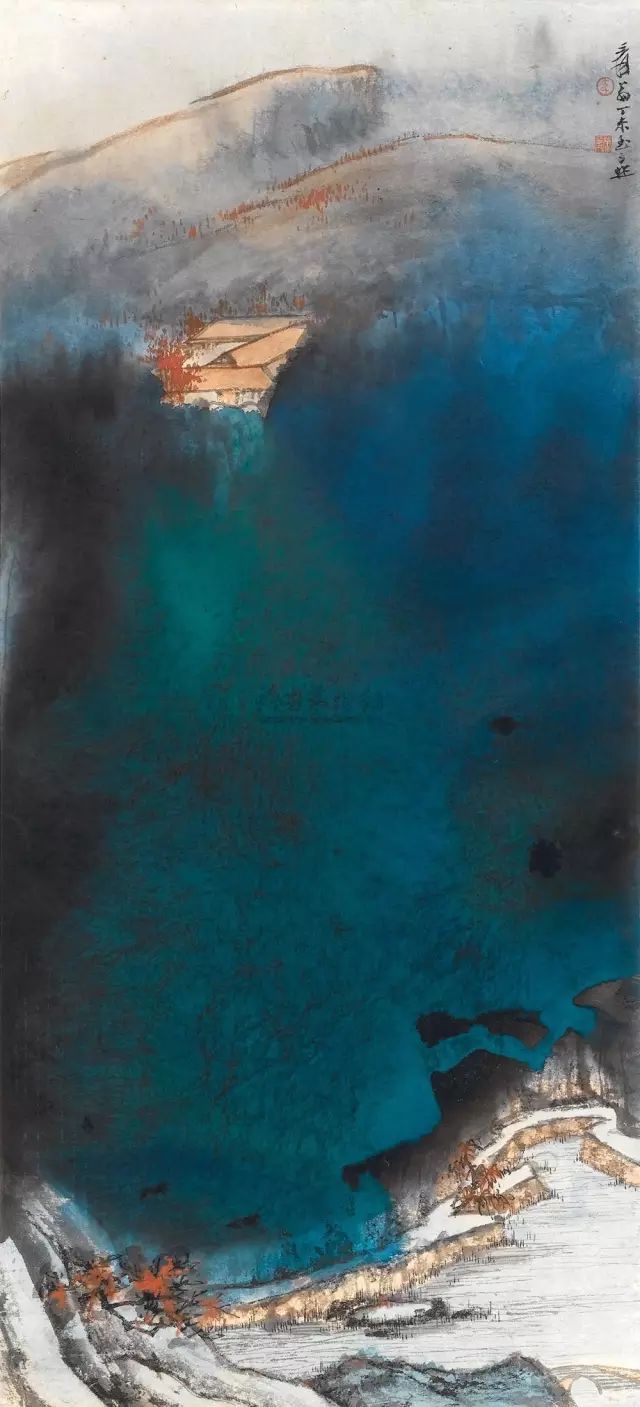 溪山初雪图 己丑(1949年)作 中国嘉德2011春拍 成交价:RMB 15,525,000 此幅《溪山初雪图》自题“拟宋东说念主高克明笔”,当临自高克明《溪山雪意图》卷(现藏纽约大都会博物馆)。原行为手卷,大千匠心独运,改横幅为竖幅,改平远为高远,写雪后山岭寒冷寒寂之景。屋舍乔松用笔一点不苟,皴染整饬严谨,细节描绘精丽。肥硕中见清秀之气,清寂中现明艳之色。大千四十年代晚期临古,已能参以己意,综诸家之长,开自己面庞。此幅为其中至精之作。