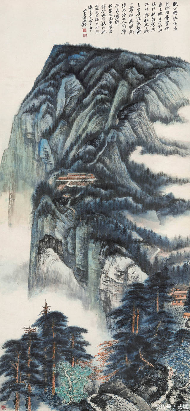 峨眉接引殿 戊子(1948年)作 中国嘉德2013春拍 成交价:RMB 32,200,000 本幅以峨眉接引殿周围山色景致入画,属大千细笔仿古山水一齐。设色以大青绿为主,使用石青、石绿、朱砂等重色,色调艳雅,极富遮挡性。大千以小斧劈皴状出山体形质,颇有北宋气度。又用吊唁披麻、解索、牛毛诸皴法打理局部细节,其笔秀润,皴法茁壮,似北苑、叔明新生。而近处松木、山间丛树、山石之上的草木苔点,又令东说念主想起清湘笔意。 同期在画面中融入大千游历峨眉时的生活体验,以当然实景之山水为描画对象,也珍藏物理、物象的写实性传达,包括山石林木的质感、当然生态以及空间透视等说明。