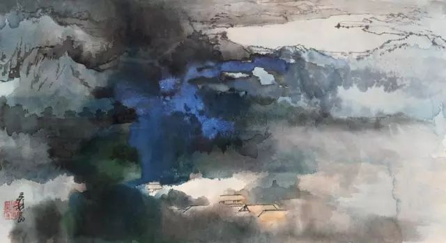 张大千 《桃源图》 泼彩的技法例是先将样子在小碟中调至所需要的色相及浓度,然后泼洒在画面上,利用其当然流淌渗化的性能,酿成画面的大体结构。 再利用色调渗化的形迹和肌理成果,用笔整理、补助允成为圆善的作品,因此这种画法具有一定的偶然身分,频频需要把柄色调落纸后的既成成果天真地养息画面。